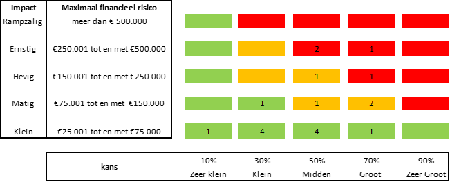 Om beter te begrijpen hoe de risico’s verdeeld zijn op basis van kans en impact, gebruiken we een risicokaart (zie hieronder). De nummers op de kaart laten zien hoeveel risico’s er in elk gebied van de risicokaart zitten. Zo wordt duidelijk hoe de risico’s verdeeld zijn over het groene, oranje en rode gebied.