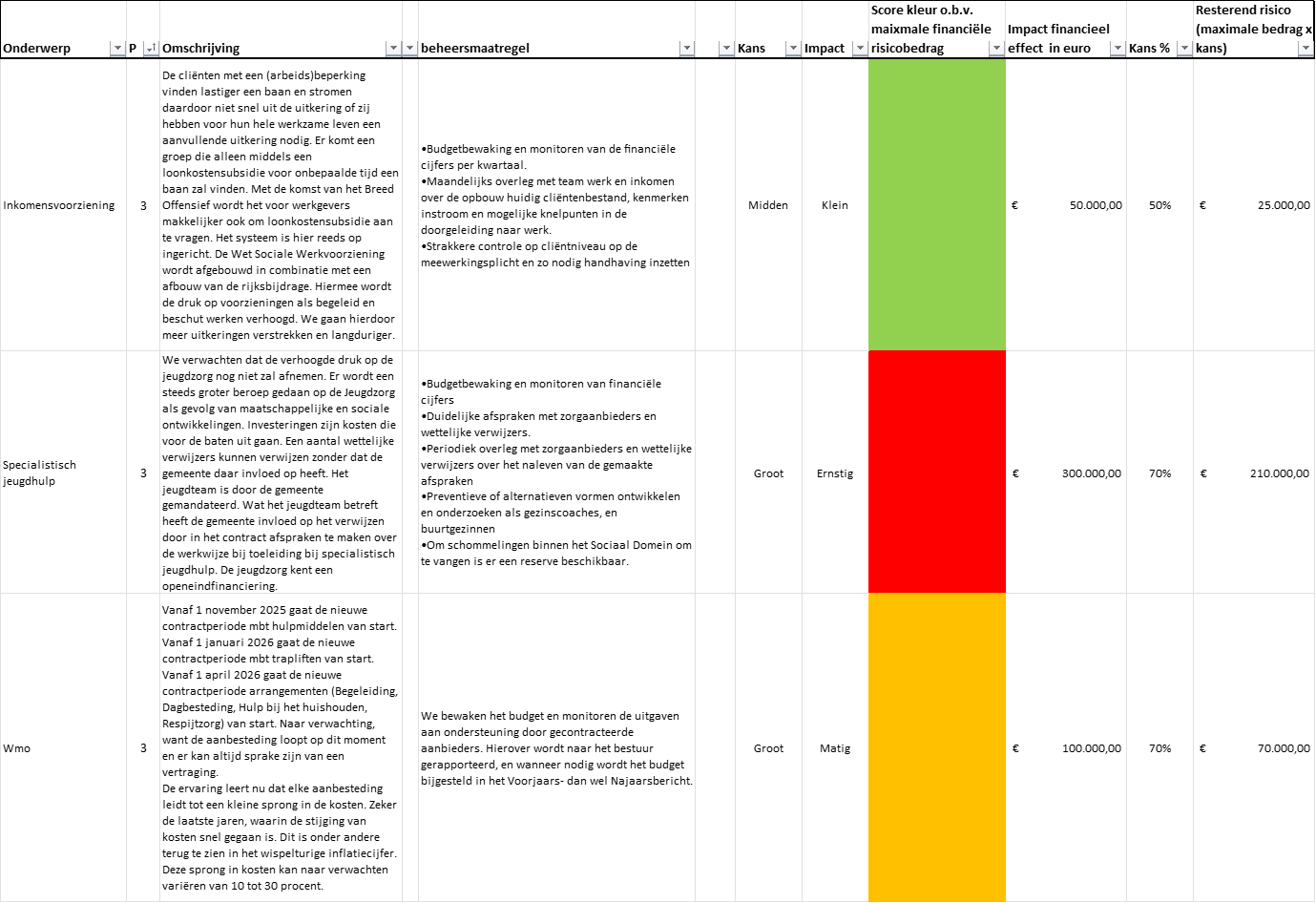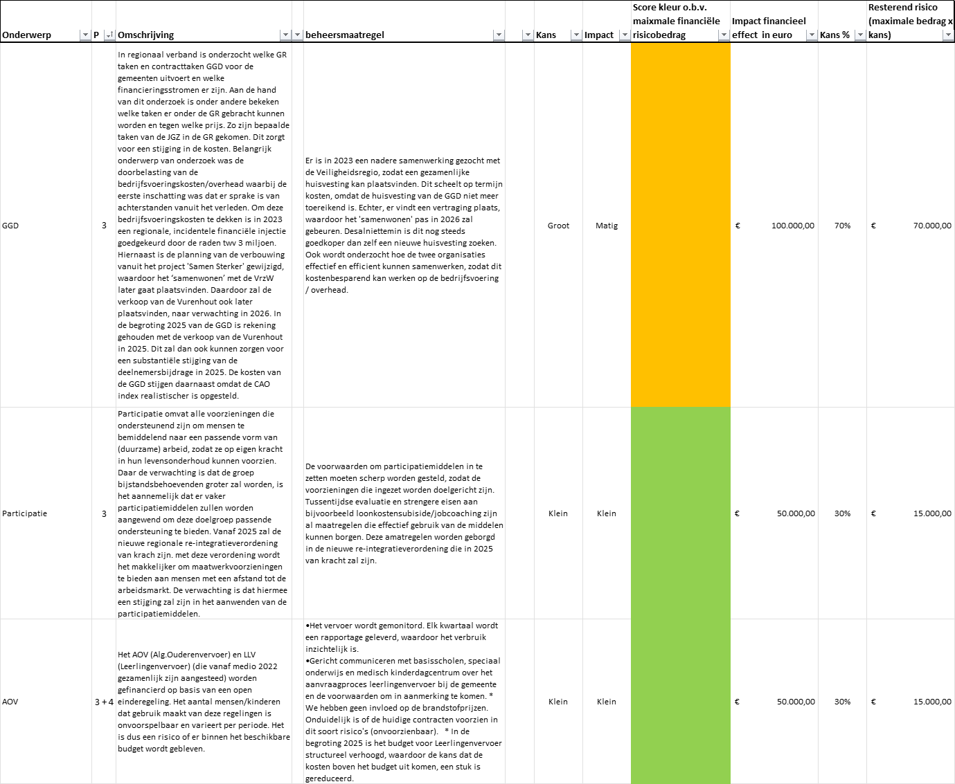 Dit betekent dat we voortdurend risico's in kaart brengen, inschatten en maatregelen nemen om ze te beheersen. Het risicoprofiel van de gemeente verandert steeds. Er kunnen nieuwe risico's ontstaan, en bestaande risico's kunnen kleiner worden of verdwijnen.