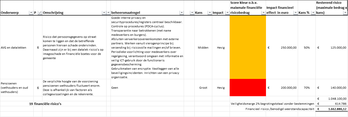 Het totaalbedrag van eventueel zich voor doende risico’s bedraagt €1.662.886.