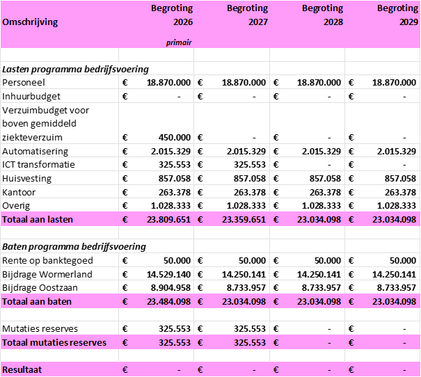 In de begroting 2026-2029 van OVER-gemeenten is voor het jaar 2026 een incidenteel budget opgenomen voor bovengemiddeld ziekteverzuim van €450.000. Hiervan komt 38% ad €171.000 voor rekening van Oostzaan in 2026, en is reeds in de begroting 2026 verwerkt. Voor de jaren 2027 – 2029 is er als volgt een incidentele stelpost gevormd voor dit ziekteverzuimbudget: