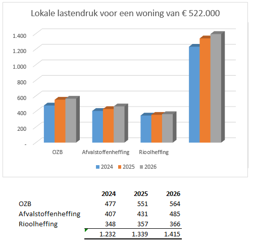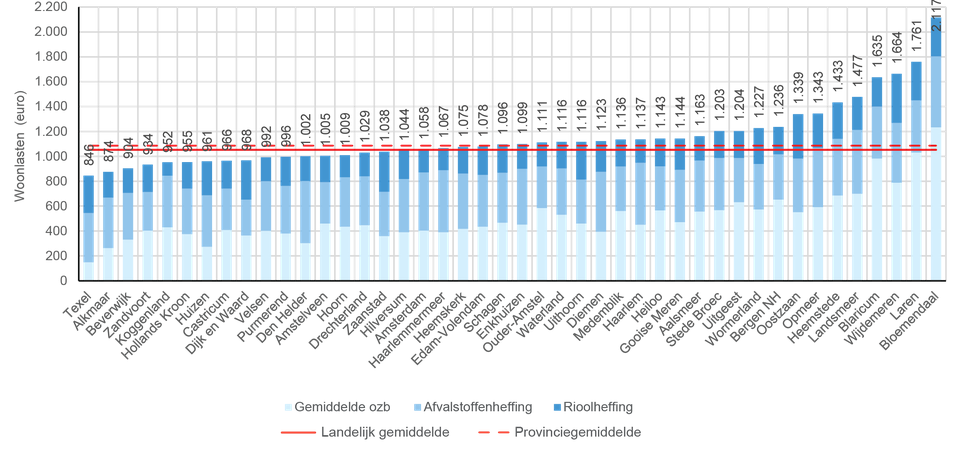 *) Bij de OZB-lasten is voor de jaren uitgegaan van de gemiddelde WOZ-waarde (€522.000). Genoemde bedragen zijn berekend tegen het eigenaarstarief. Hierin is dus niet meegenomen dat een deel van de gezinnen geen eigen woning heeft. Niet bekend is hoe dit bij de landelijk gemiddelde woonlasten is verwerkt.